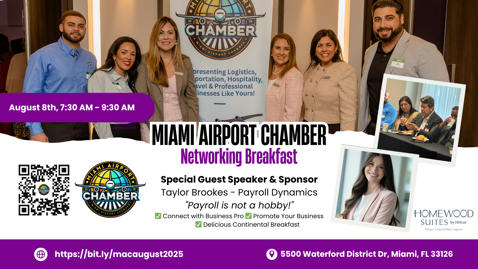 94th Aero Squadron 1395 NW 57th Ave, MiamiMiami Airport Chamber Executive Lunch Friday, August 22nd, 11:30 AM to 2:00 PM With Special Guest Speaker: Calvin Rodriguez Vice President, Sales & Engagement - Travel Planners International Connect with South Florida's dynamic business community at the Miami Airport Chamber's upcoming event, held at the 94th Aero Squadron Restaurant. This gathering offers a valuable opportunity to […]